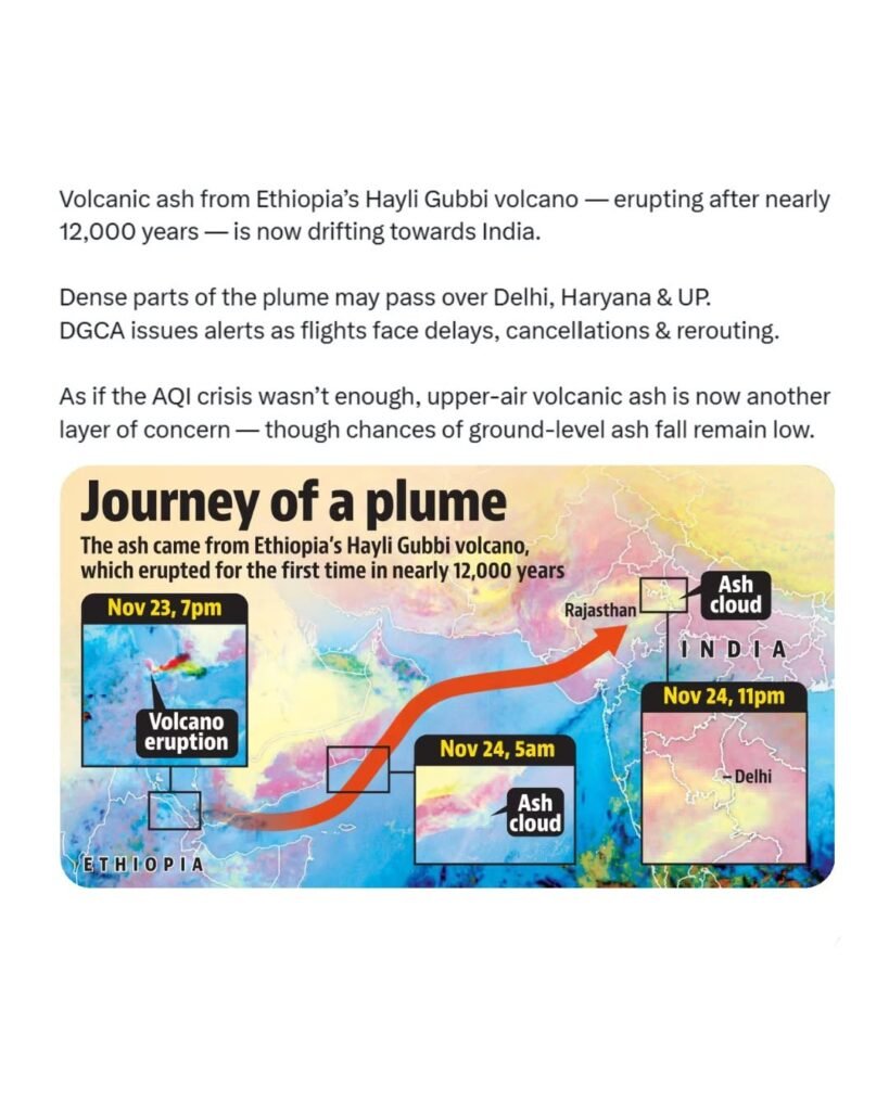 In late November 2025, ash plumes from the Hayli Gubbi volcano drifted across the Red Sea, through the Middle East, and into parts of northwestern India — including the Delhi-NCR region. Authorities have closely monitored the situation because Delhi’s AQI was already in the very poor to severe range.